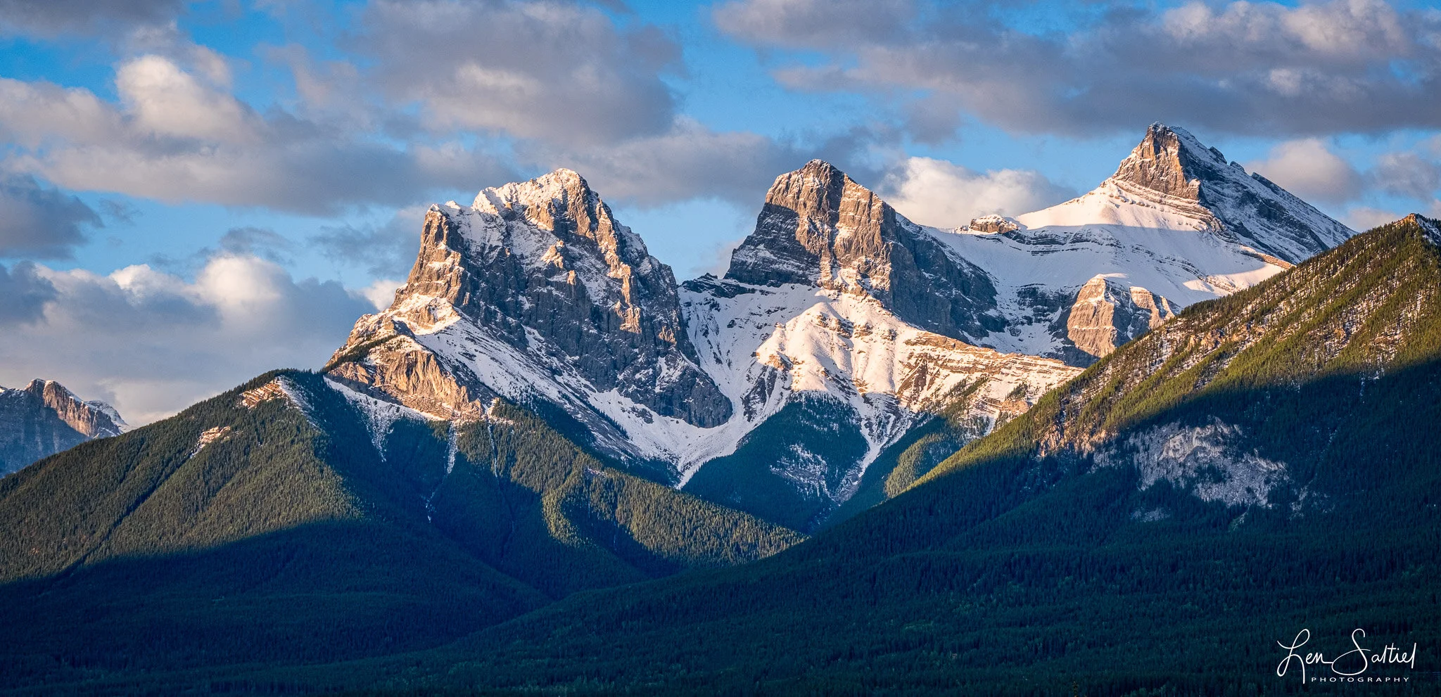 Being tired from our travel from the eastern United States, we headed out on our first full day to explore Kananaskis Country. We spent the full day driving south, seeing and photographing the wonders that this section of the Canadian Rockies had to offer. Getting back into Canmore and having a late dinner, we crashed. The next thing I knew, it was the next morning and saw that the sun was out. Looking out the window, this scene of the “Three Sisters” presented themselves to me. I quickly grabbed my camera to get some photos of the mountains bathed in beautiful light with great cumulous clouds as a backdrop.